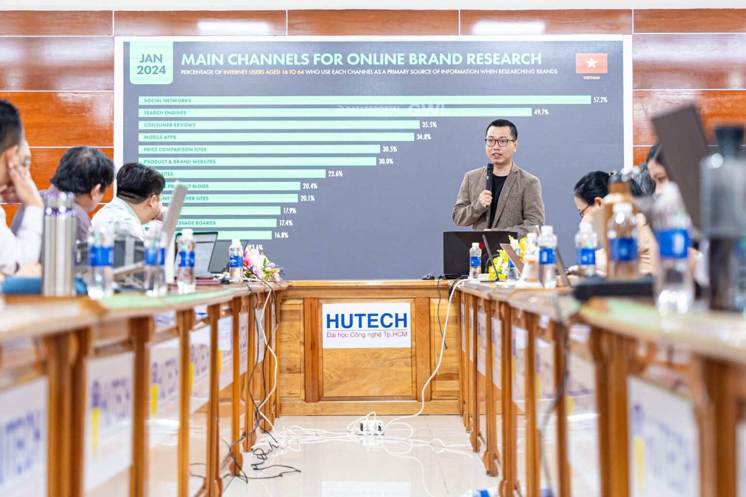 Chương trình “Tiếp thị qua công cụ tìm kiếm – SEM” đã thu hút sự tham gia của nhiều nhà quản lý, giảng viên và cán bộ từ Trường Đại học Công nghệ TP.HCM (HUTECH). Cụ thể: Tham dự chương trình có GS.TS. Nguyễn Trung Kiên – Phó Hiệu trưởng Nhà trường, PGS.TS. Nguyễn Phú Tụ – Trưởng Khoa Marketing – Kinh doanh quốc tế, TS. Trà Thị Thảo – Phó Trưởng Khoa, TS. Nguyễn Tiến Thành – Phó Trưởng Khoa cùng đông đảo cán bộ, giảng viên và nhân viên của Khoa. Sự tham gia của đội ngũ lãnh đạo và giảng viên chủ chốt của Khoa Marketing – Kinh doanh quốc tế cho thấy tầm quan trọng mà Nhà trường và Khoa dành cho việc nâng cao năng lực đào tạo, đáp ứng nhu cầu về nhân lực chất lượng cao trong lĩnh vực marketing và kinh doanh quốc tế.