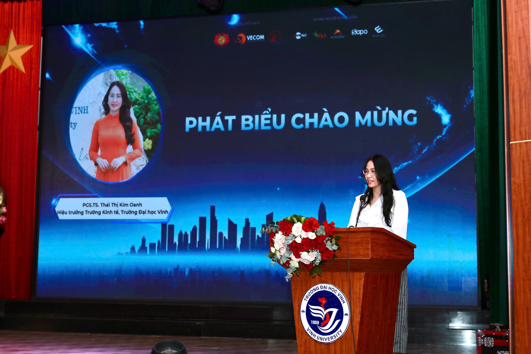 PGS. TS. Nguyễn Thị Thu Cúc – Phó Hiệu trưởng Đại học Vinh tham dự sự kiện và mở đầu chương trình, PGS.TS. Thái Thị Kim Oanh – Hiệu Trưởng Trường Kinh tế – Đại học Vinh nhấn mạnh: “Chúng ta đang sống trong một thế giới mà công nghệ đang thay đổi từng ngày, từ cách tiêu dùng đến cách kinh doanh. Thương mại điện tử giờ đây không còn là khái niệm xa lạ, mà đã trở thành một phần không thể thiếu trong nhịp sống hiện đại. Trong bối cảnh đó, các bạn sinh viên – những chủ nhân tương lai của nền kinh tế số cần trang bị cho mình hành trang vững chắc về kiến thức, kỹ năng và tư duy công nghệ, để không chỉ thích nghi mà còn dẫn đầu trong kỷ nguyên mới”.