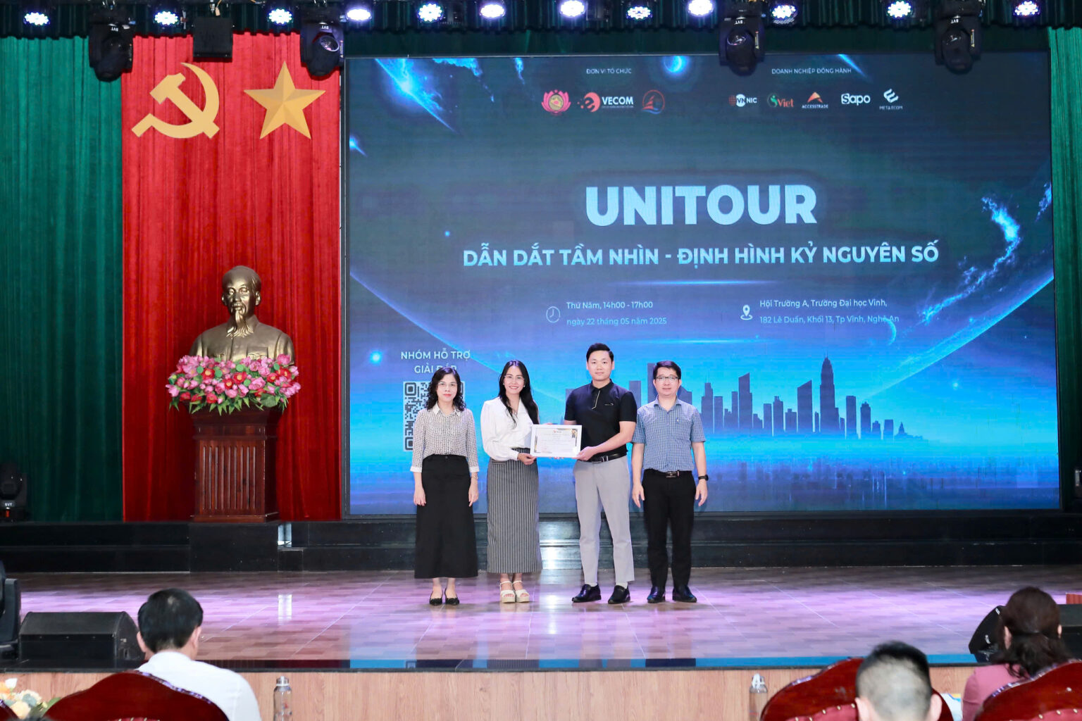 Chiều 22/5/2025, Hiệp hội Thương mại điện tử Việt Nam (VECOM) phối hợp cùng Trường Kinh tế – Đại học Vinh tổ chức thành công chương trình Unitour 2025 với chủ đề “DẪN DẮT TẦM NHÌN – ĐỊNH HÌNH KỶ NGUYÊN SỐ” và đón nhận sự tham gia của gần 500 sinh viên đến từ các ngành kinh tế, công nghệ thông tin và du lịch. Trường Kinh tế, Đại học Vinh trở thành điểm cầu đầu tiên trong chuỗi Unitour 2025 khắp cả nước của Hiệp hội Thương mại điện tử Việt Nam. Đặc biệt, sự kiện vinh dự nhận được sự quan tâm và tham dự của Sở Công Thương Nghệ An.