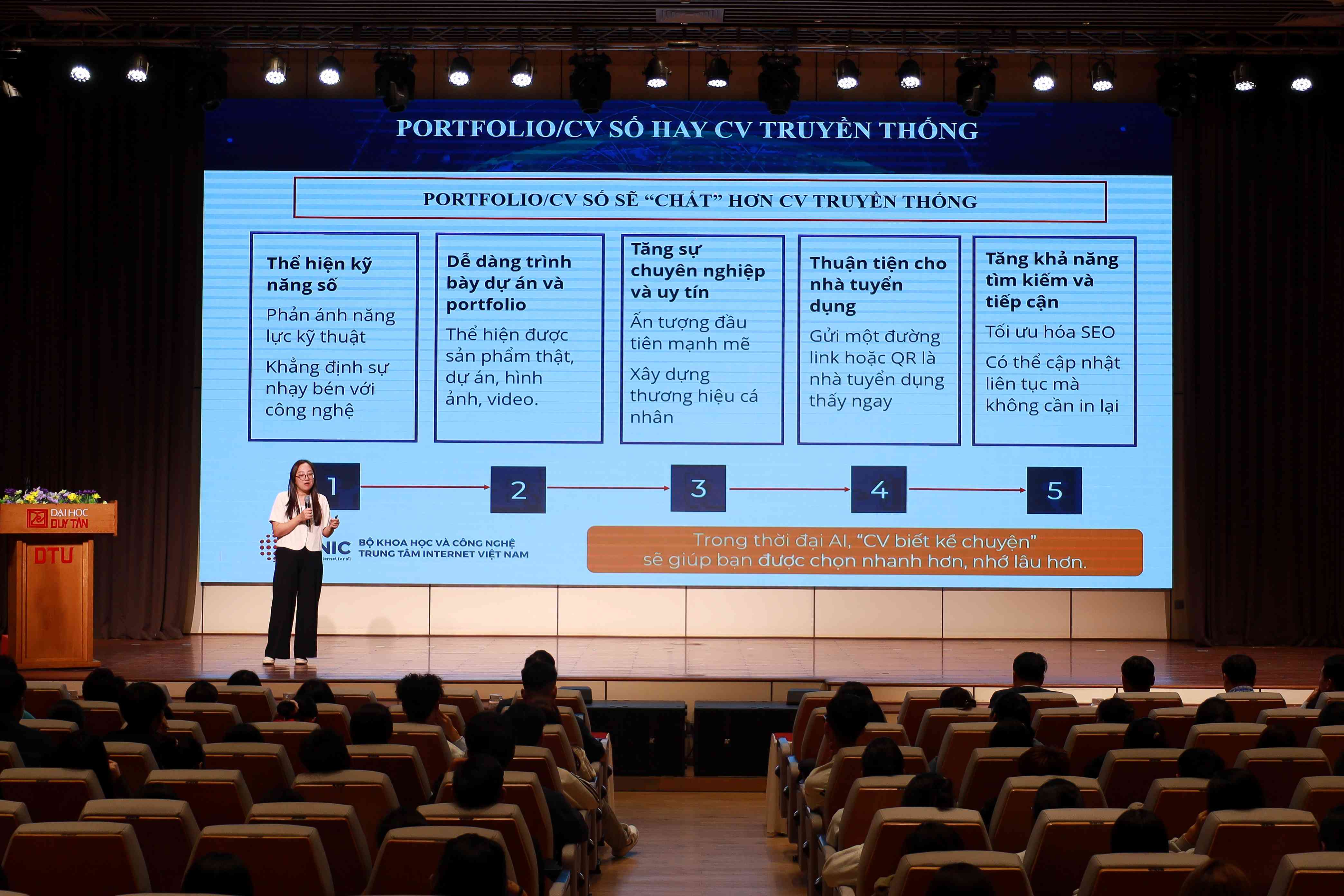 Chị Phan Nguyên Ngọc Anh đại diện Trung tâm Internet Việt Nam thuộc Bộ Khoa học và Công nghệ đã nhấn mạnh tầm quan trọng của việc xây dựng thương hiệu cá nhân trong kỷ nguyên số. Với công cụ id.vn, sinh viên có thể sở hữu một “danh thiếp số” uy tín, giúp khẳng định giá trị bản thân trên môi trường trực tuyến. Đây không chỉ là bước khởi đầu để tạo dấu ấn cá nhân mà còn là “tấm vé vàng” để sinh viên tự tin bước vào thị trường việc làm cạnh tranh, nơi nhà tuyển dụng đánh giá cao sự chuyên nghiệp và khả năng hiện diện số của ứng viên.