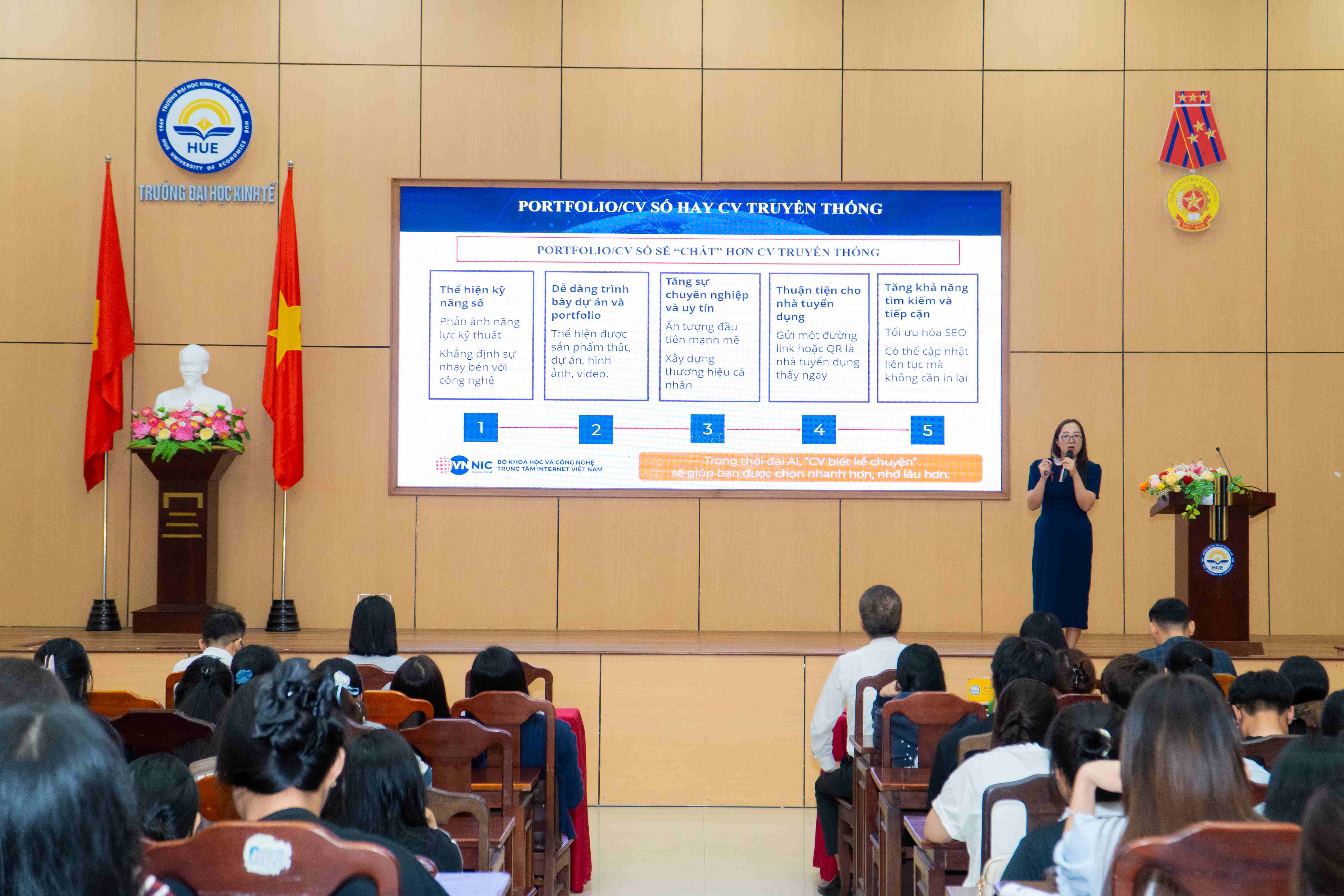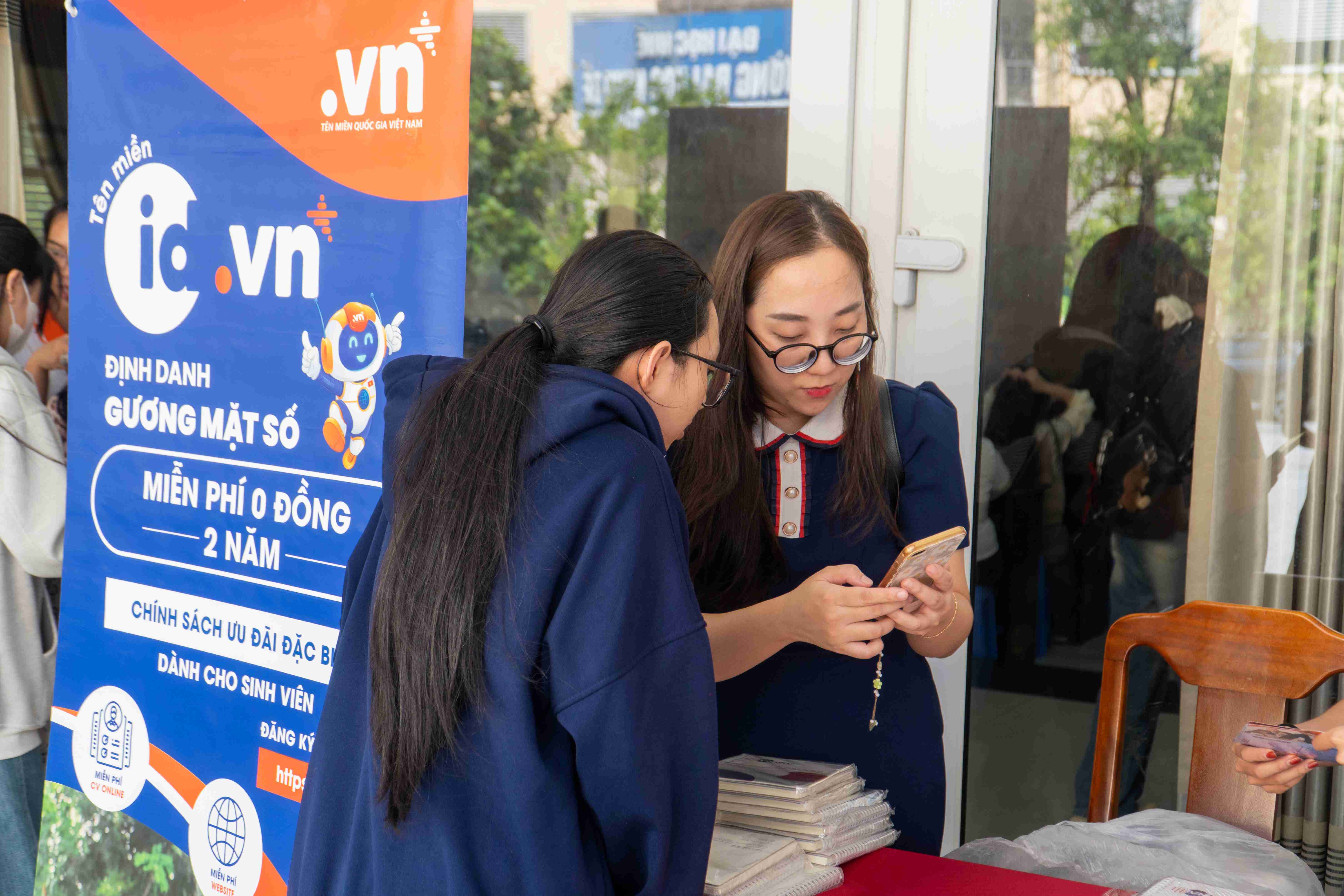 Chị Phan Nguyên Ngọc Anh đại diện Trung tâm Internet Việt Nam thuộc Bộ Khoa học và Công nghệ đã nhấn mạnh tầm quan trọng của việc xây dựng thương hiệu cá nhân trong kỷ nguyên số. Với công cụ id.vn, sinh viên có thể sở hữu một “danh thiếp số” uy tín, giúp khẳng định giá trị bản thân trên môi trường trực tuyến. Đây không chỉ là bước khởi đầu để tạo dấu ấn cá nhân mà còn là “tấm vé vàng” để sinh viên tự tin bước vào thị trường việc làm cạnh tranh, nơi nhà tuyển dụng đánh giá cao sự chuyên nghiệp và khả năng hiện diện số của ứng viên.