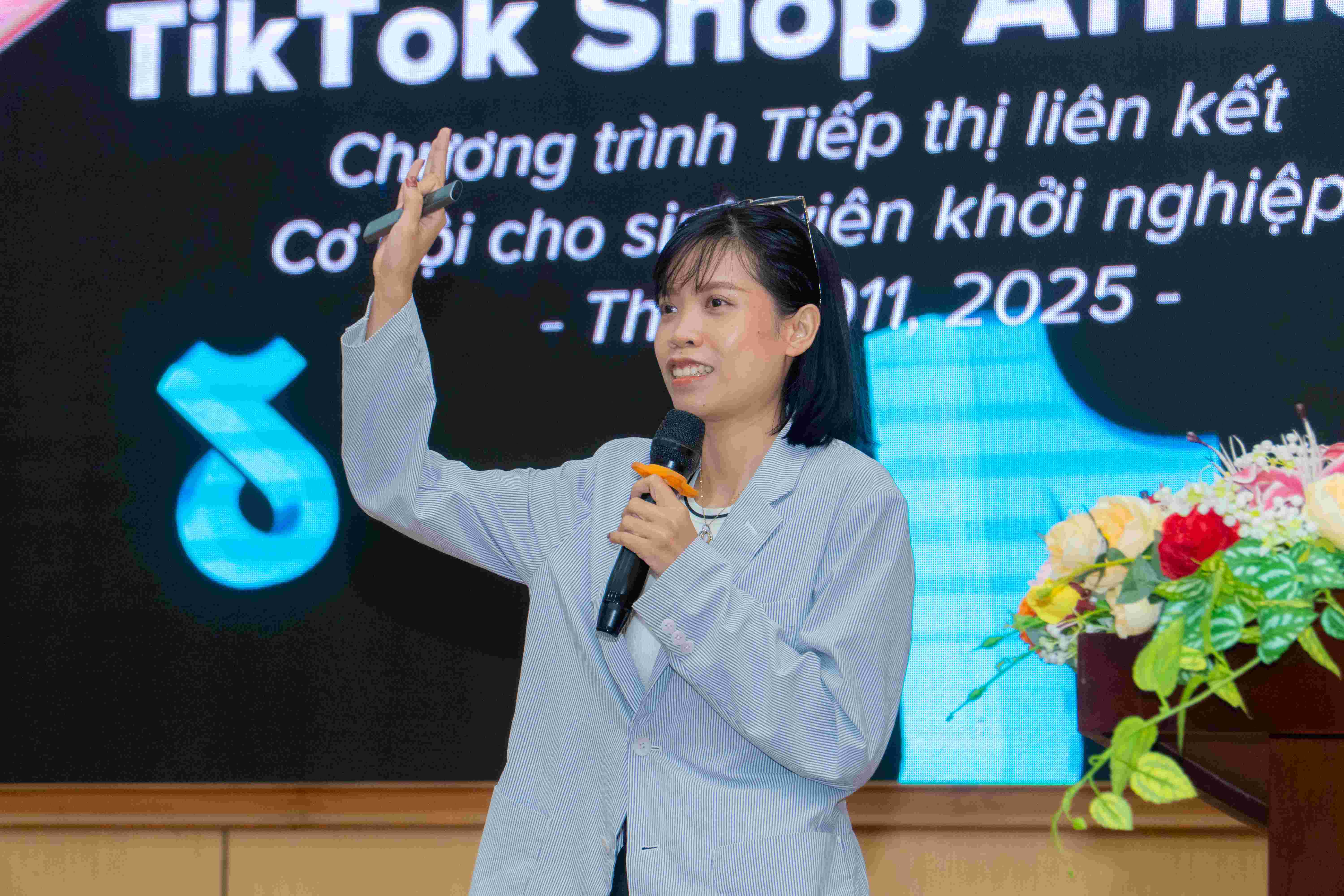 Chị Hà Đỗ, Quản lý Dự án Trách nhiệm Xã hội, TikTok Shop Việt Nam, đã chia sẻ về chủ đề “Affiliate Marketing trên TikTok Shop – Cơ hội cho sinh viên khởi nghiệp”, mang đến nhiều góc nhìn thực tế về xu hướng thương mại điện tử và sáng tạo nội dung trong kỷ nguyên số. Theo chị Hà Đỗ, Affiliate Marketing (tiếp thị liên kết) đang trở thành một trong những hình thức kinh doanh tiềm năng nhất đối với giới trẻ hiện nay. Với TikTok Shop, sinh viên hoàn toàn có thể bắt đầu hành trình khởi nghiệp của mình bằng cách tận dụng sức sáng tạo, khả năng truyền thông và hiểu biết người tiêu dùng, mà không cần vốn lớn hay kinh nghiệm thương mại truyền thống.