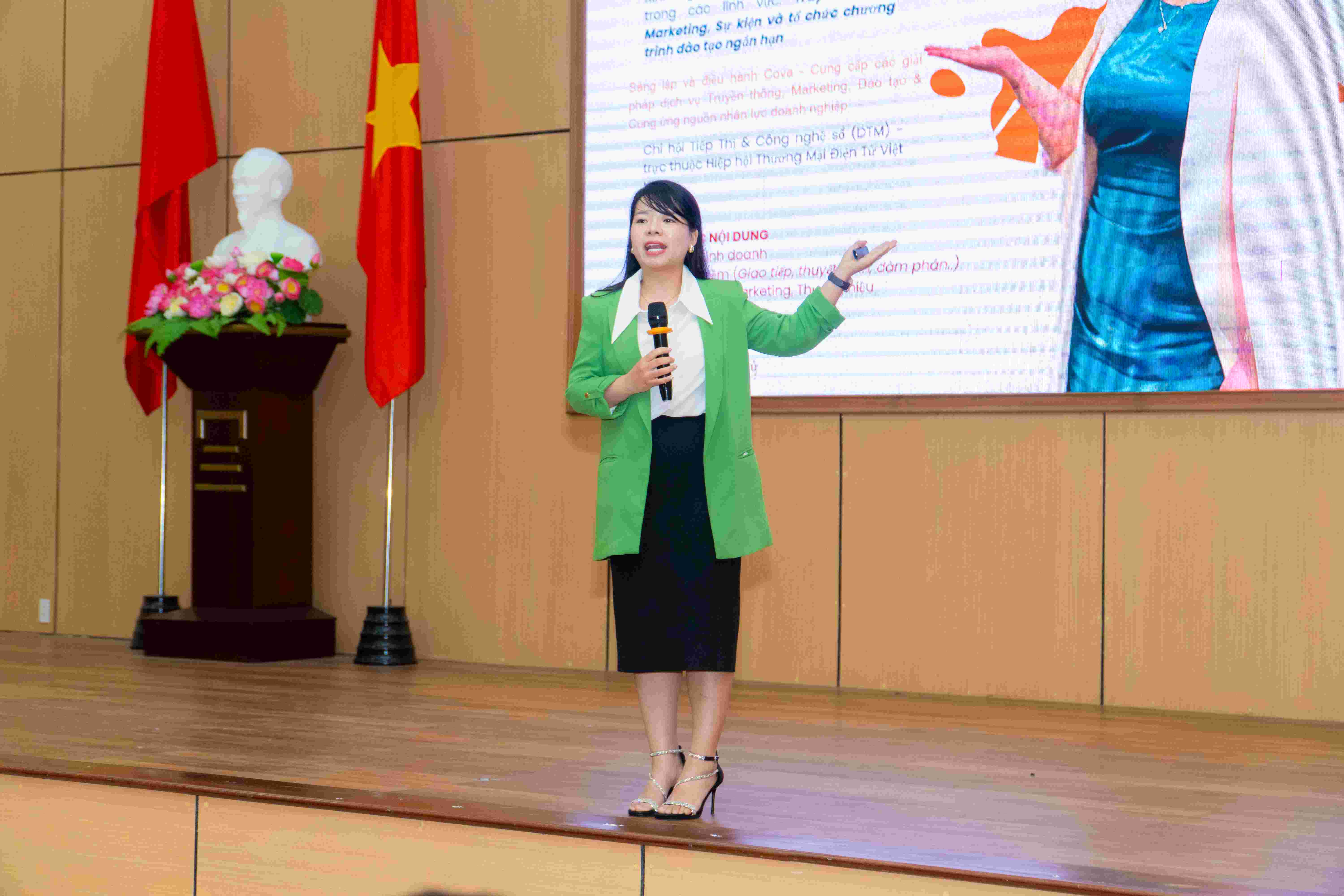 Trong chủ đề về cơ hội nghề nghiệp của sinh viên trong kỷ nguyên số, chương trình tiếp tục mang đến phần chia sẻ đầy cảm hứng từ chị Trần Phượng – Founder Cova Media, Thành viên Ban điều hành Chi hội Digital Trade Marketing (VECOM) với nội dung “Cơ hội của nhân sự số trong bối cảnh kinh tế số.” Theo chị Phượng, sự phát triển mạnh mẽ của kinh tế số đã và đang mở ra nhiều hướng đi mới cho thế hệ trẻ, đặc biệt là những sinh viên biết nắm bắt xu hướng, ứng dụng công nghệ và khai thác sức mạnh của nền tảng số trong công việc. Tuy nhiên, song song với cơ hội là những yêu cầu mới về kỹ năng, từ tư duy số, khả năng sáng tạo đến năng lực thích ứng nhanh trong môi trường thay đổi liên tục.
