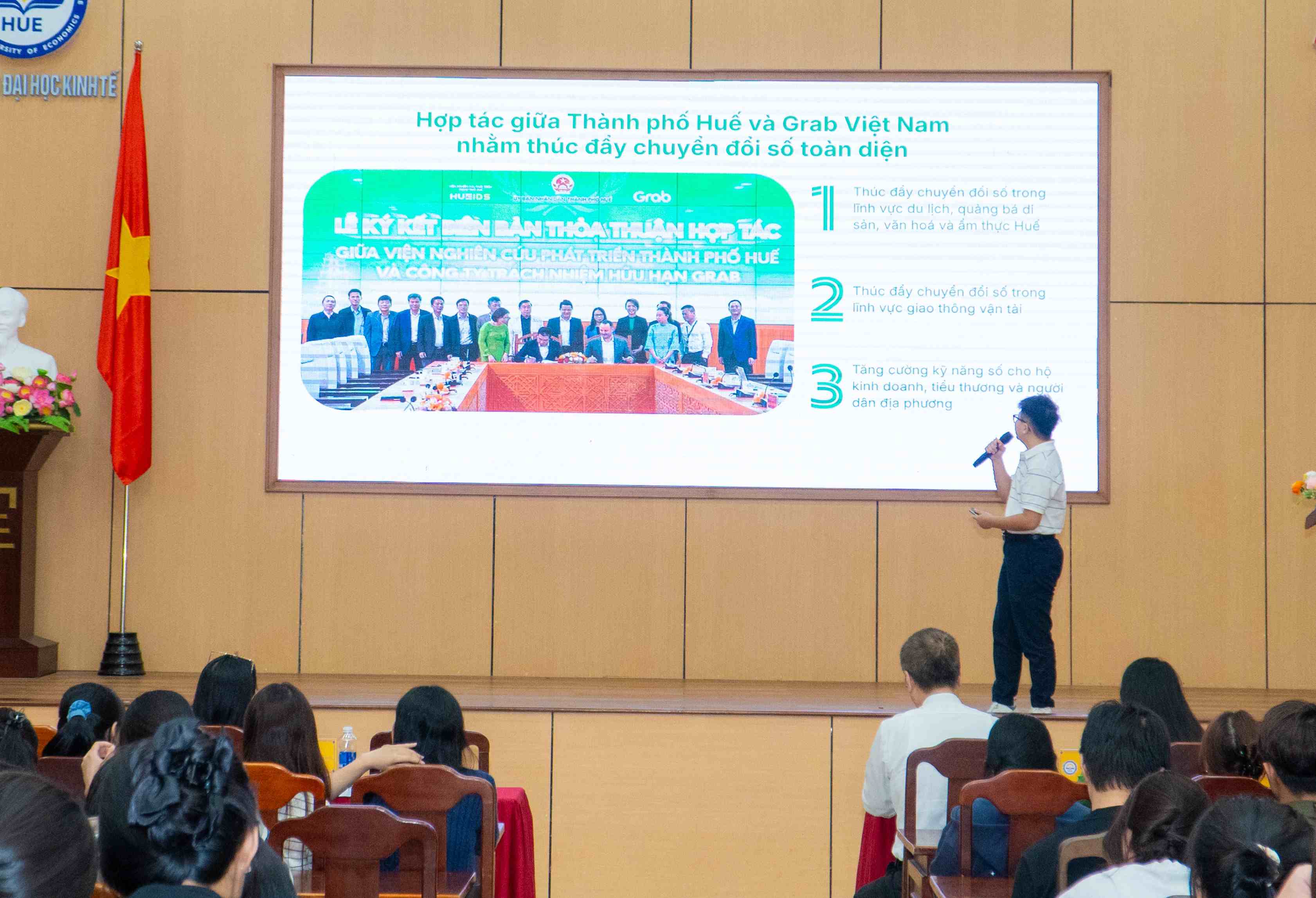 Trong chủ đề về khởi nghiệp và đổi mới sáng tạo trong kỷ nguyên số, chương trình chào đón phần chia sẻ từ anh Nguyễn Hoàng Linh – Quản lý Đối ngoại cấp cao, Grab Việt Nam với bài trình bày “Từ ý tưởng khởi nghiệp ban đầu đến hệ sinh thái siêu ứng dụng.” Anh Linh đã mang đến hành trình phát triển đầy ấn tượng của Grab – từ một ý tưởng startup nhỏ trong lĩnh vực gọi xe, đến nay đã trở thành hệ sinh thái siêu ứng dụng bao phủ nhiều lĩnh vực như di chuyển, giao hàng, tài chính, và dịch vụ số. Qua đó, anh nhấn mạnh rằng thành công của Grab không đến từ may mắn, mà từ tư duy linh hoạt, khả năng thấu hiểu thị trường và không ngừng đổi mới để phục vụ nhu cầu người dùng.