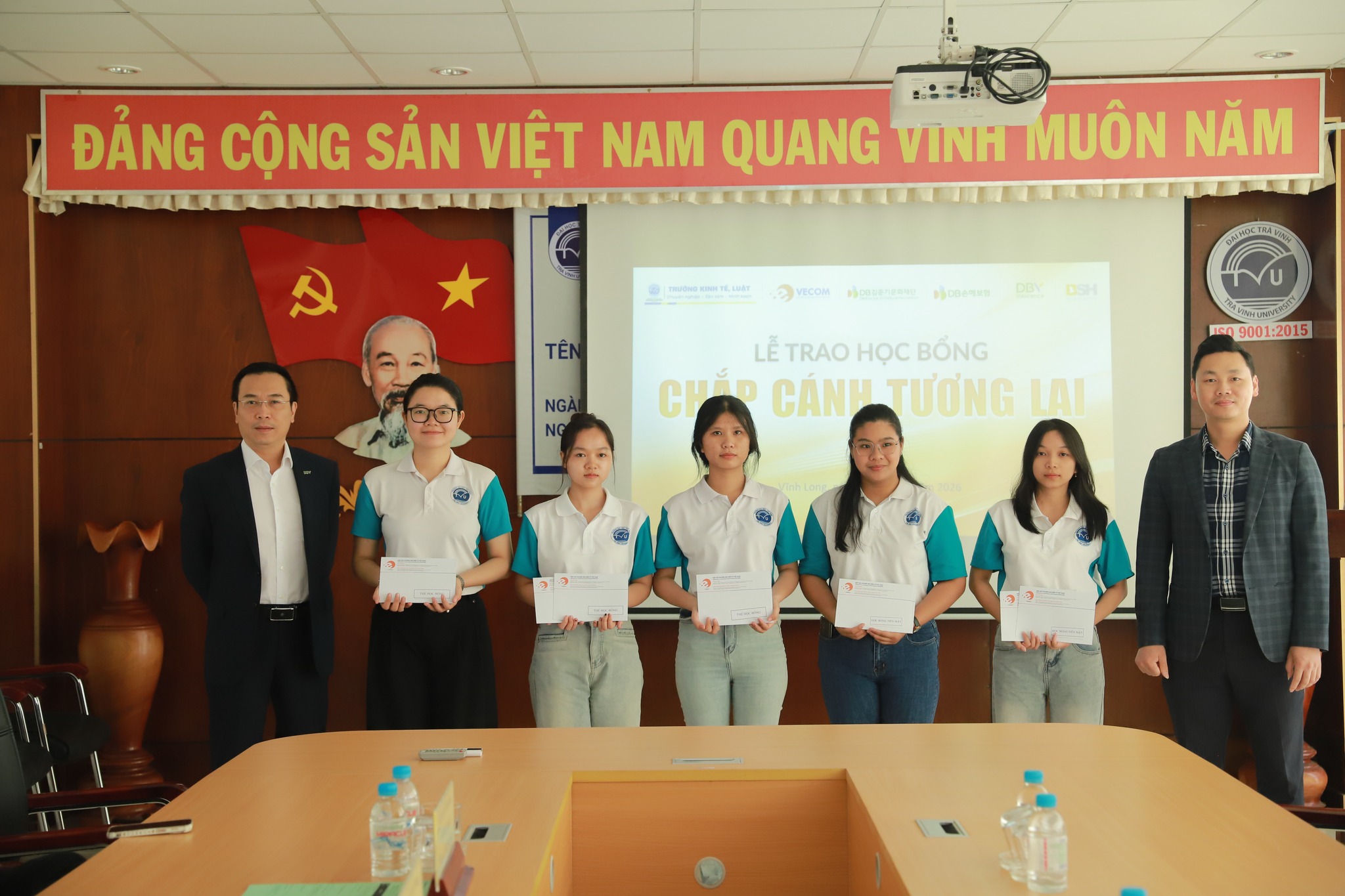 Sáng ngày 20/03/2026, tại Trường Kinh tế, Luật - Trường Đại học Trà Vinh, Hiệp hội Thương mại điện tử Việt Nam (VECOM) đã phối hợp cùng Quỹ văn hóa DB Kim Jun Ki, Công ty Bảo hiểm DBI Hàn Quốc và Tổng công ty Cổ phần Bảo hiểm Sài Gòn - Hà Nội tổ chức lễ trao học bổng dành cho sinh viên có hoàn cảnh khó khăn nhưng nỗ lực vươn lên trong học tập.