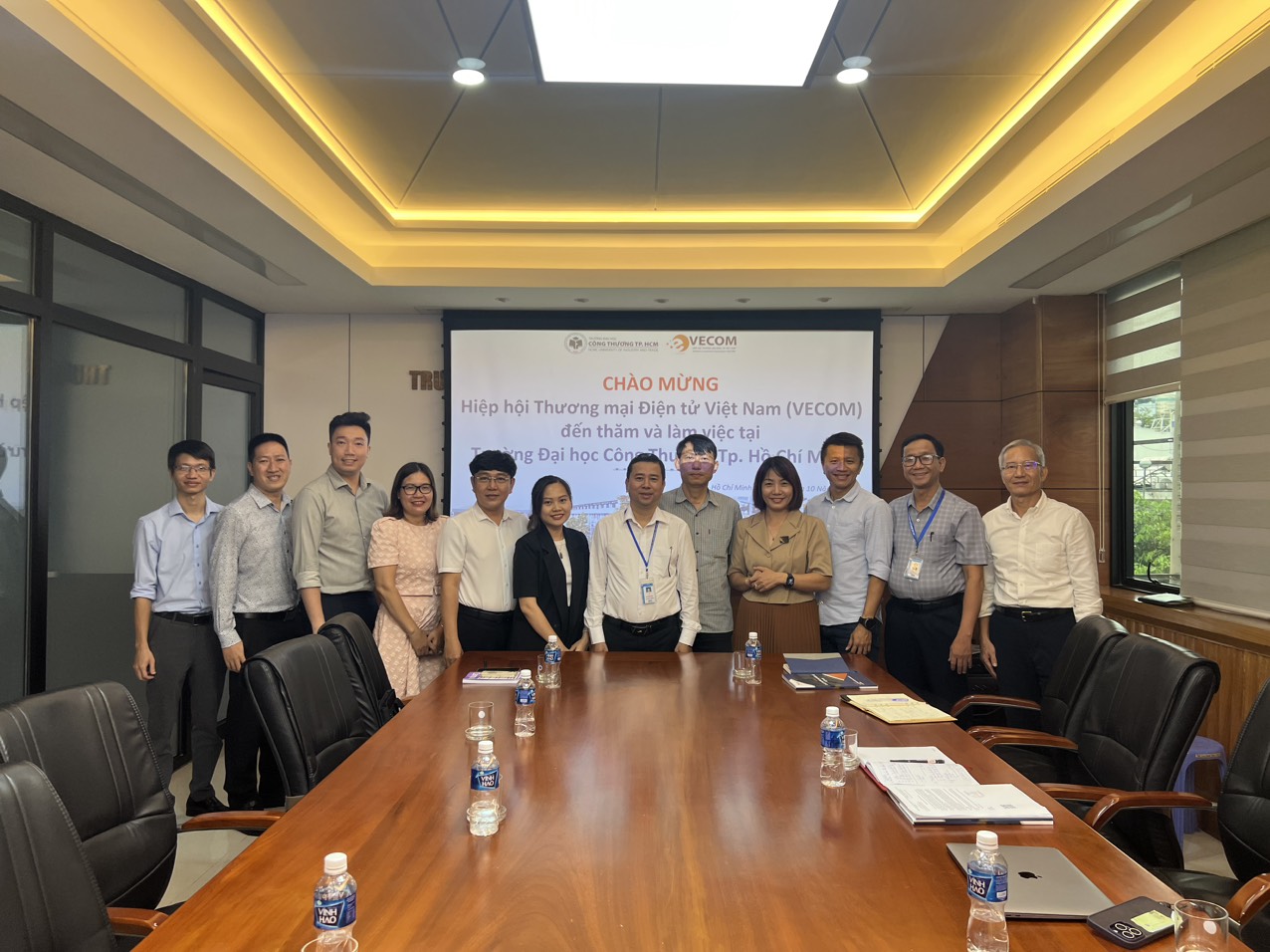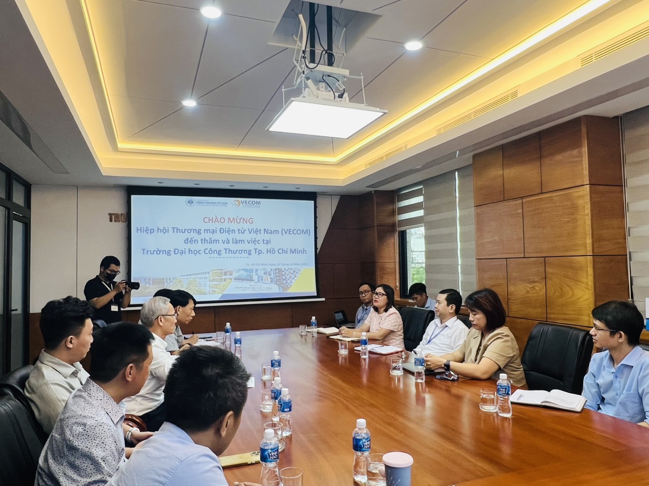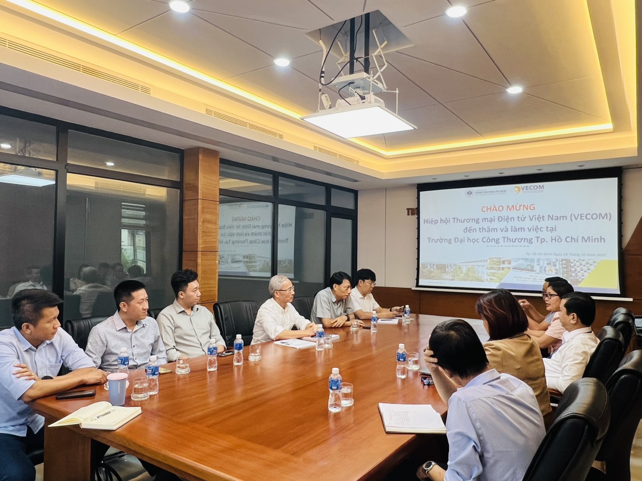 TS. Bùi Hồng Đăng – Phó Hiệu trưởng, đã chia sẻ nhiều thông tin về hoạt động đào tạo của trường với Đoàn công tác của VECOM do ông Ngô Minh Đức là Trưởng đoàn. Các ông Nguyễn Tấn Phong – Trưởng ban Kiểm tra, ông Huỳnh Lâm Hồ – Phó trưởng ban Nền tảng TMĐT, ông Phạm Sơn Tùng – Phó Ban Hợp tác và ông Đinh Huy Thành – đại diện Mắt Bão của Đoàn VECOM đã bày tỏ sự ủng hộ mạnh mẽ với hoạt động đào tạo thương mại điện tử tại các trường đại học, gợi ý những nội dung hợp tác cụ thể. Ông Nguyễn Thanh Hưng – thành viên Hội đồng Tư vấn cấp cao phụ trách lĩnh vực đào tạo đã giới thiệu các hoạt động đa dạng của Mạng lưới các trường đại học đào tạo TMĐT (VECOMNET), Báo cáo Đào tạo Thương mại điện tử năm 2022 và tình hình xây dựng Báo cáo này năm 2023.